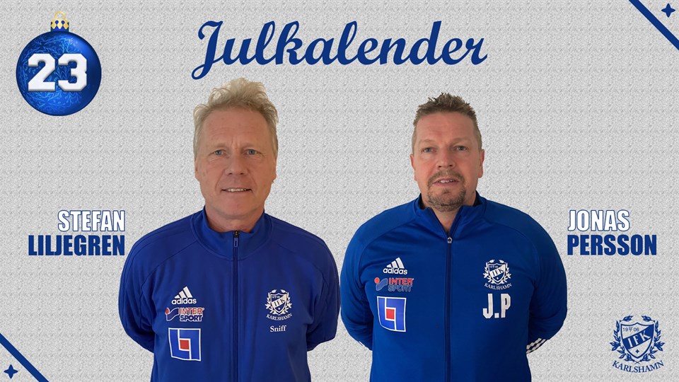 LUCKA 22 - Jonas Bjurbrant & Alex Persson I dagens lucka hittar vi den nya tränarduon för Div.5-laget, Jonas och Alex. Jonas Bjurbrant Ålder? 45år Moderklubb? Hällaryds IF Tidigare klubbar som tränare? Asarum, Mjällby, Högadal, Svängsta och SGIF Vad gör du på din fritid? Umgås med familj och vänner plus att jag kollar på fotboll i mängder. Bästa IFK-minne? När vi gick till A-slutspel i Laxacupen med IFK F02/03 Vilken är din favorit fotbollsspelare genom alla tider? Kan inte välja mellan Frank Lampard och Markus Rosenberg så det får bli bägge! Vilken är din favoritmåltid lagad av Kocken på torsdagar? Har inte haft den stora äran att pröva kockens mat ännu, men jag har förstått att kycklingen lär vara magisk. ***** Alex Persson Ålder? 26år Moderklubb? IFK Karlshamn Tidigare klubbar som tränare? Inga. Det här är mitt första uppdrag som tränare. Vad gör du på din fritid? Tittar och följer mycket fotboll på tv, speciellt Premier League och Manchester United. Annars umgås jag med vänner och familj. Bästa IFK-minne? Det är väl egentligen alla ungdomsåren. Alla cuper man var och spelade. Det är dom bästa minnena. Vilken är din favorit fotbollsspelare genom alla tider? Zinedine Zidane och Paul Scholes. Helt magiska! Vilken är din favoritmåltid lagad av Kocken på torsdagar? Längesen jag åt kockens mat nu. Men jag minns att revbensspjäll med potatis och sås var riktigt fint!