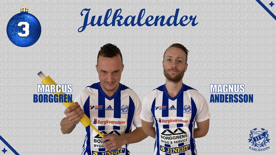 Lucka 3 - Marcus Borggren & Magnus Andersson 3 December och i dagens lucka hittar vi mittbackarna Bogge och Mange. Marcus Borggren Ålder: 25 Position: Mittback Moderklubb: IFÖ Bromölla Vad gör du när du inte spelar fotboll? Driver eget med min far som snickare, utöver det så läggs det en hel del tid på huset som jag och min sambo nyligen köpt. Vilket är ditt bästa IFK-minne? Det måste ändå vara när vi vann Division 3 Om du skulle likna dig själv med en annan fotbollspelare, vem skulle det vara? Nemanja Vidic Vilken är din favoritmåltid lagad av Kocken på torsdagar? Svår fråga, men hans fläskfilé med potatis och brunsås är helt magisk! Magnus Andersson Ålder: 27 Position: Mittback Moderklubb: Vittskövle IF Vad gör du när du inte spelar fotboll? Arbetar som socialsekreterare, lever familjeliv och tränar. Vilket är ditt bästa IFK-minne? Kort tid i klubben änsålänge, men det får nog bli den nästsista matchen för säsongen mot IFK Hässleholm, där vi vände och vann med 1-2. Om du skulle likna dig själv med en annan fotbollspelare, vem skulle det vara? Phil Jones Vilken är din favoritmåltid lagad av Kocken på torsdagar? Kocken lagar grym mat, vad spelar ingen större roll!