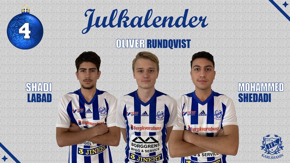 LUCKA 4 - Shadi Labad, Oliver Rundqvist och Mohamed Shedadi I dagens lucka träffar vi på tre mycket talangfulla spelare som kommit upp ifrån de egna leden. Shadi Labad Ålder? 18 Position? Ytterback Moderklubb? IFK Karlshamn Vad gör du när du inte spelar fotboll? Jag går i skolan, jobbar och hänger med kompisar. Bästa IFK-minne? SM Guld i Futsal Om du skulle likna dig med en annan fotbollsspelare, vilken? Vet inte. Vilken är din favoritmåltid lagad av Kocken på torsdagar? Kycklingen är min favorit. ***** Oliver Rundqvist Ålder? 18 Position? Ytterback, Yttermittfältare Moderklubb? IFK Karlshamn Vad gör du när du inte spelar fotboll? Går i skolan, umgås med kompisar och spelar TV-spel Bästa IFK-minne? SM-Guldet i futsal. Om du skulle likna dig med en annan fotbollsspelare, vilken? Sergi Roberto Vilken är din favoritmåltid lagad av Kocken på torsdagar? Kyckling, potatis och brunsås! ***** Mohammed Shedadi Ålder? 18 Position? Forward Moderklubb? IFK Karlshamn Vad gör du när du inte spelar fotboll? Går i skolan, hänger med vänner och jobbar. Bästa IFK-minne? SM-Guld i futsal! Om du skulle likna dig med en annan fotbollsspelare, vilken? Vet inte riktigt.. Vilken är din favoritmåltid lagad av Kocken på torsdagar? Kycklingen!