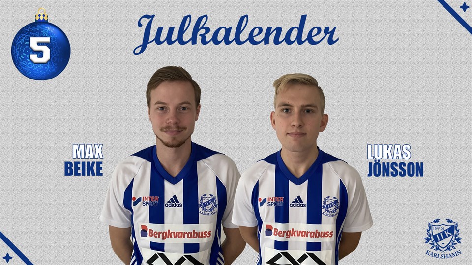 Lucka 5 - Max Beike & Lukas Jönsson I dagens lucka möter vi kusinerna och hemvändarna Max och Lukas Max Beike Ålder? 19år Position? Innermittfältare Moderklubb? IFK Karlshamn Vad gör du när du inte spelar fotboll? Jag jobbar och umgås med kompisar. Bästa IFK-minne? Har bara bra minnen med IFK så kan inte välja ett Om du skulle likna dig med en annan fotbollsspelare, vilken? Donny van de Beek Vilken är din favoritmåltid lagad av Kocken på torsdagar? Kocken gör bara bra mat ***** Lukas Jönsson Ålder? 18år Position? Ytter/Forward Moderklubb? IFK Karlshamn Vad gör du när du inte spelar fotboll? Då går jag i skolan, umgås med vänner och tränar på egen hand. Bästa IFK-minne? Jag har många bra minnen i IFK, men det är nog antingen SM-guldet i Futsal eller Seriesegern i Division 3! Om du skulle likna dig med en annan fotbollsspelare, vilken? Skulle säga att jag påminner lite om Hazard i Chelsea. Vilken är din favoritmåltid lagad av Kocken på torsdagar? All mat av kocken är bra mat!
