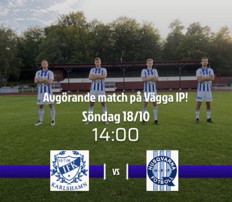 På söndag 18/10 kl 14:00 spelas den sista seriematchen i herrarnas div 2 På besök kommer Jönköpings klubben Husqvarna FF. De 50 biljetterna är slut, dock sänder Blekingesporten matchen på webben.