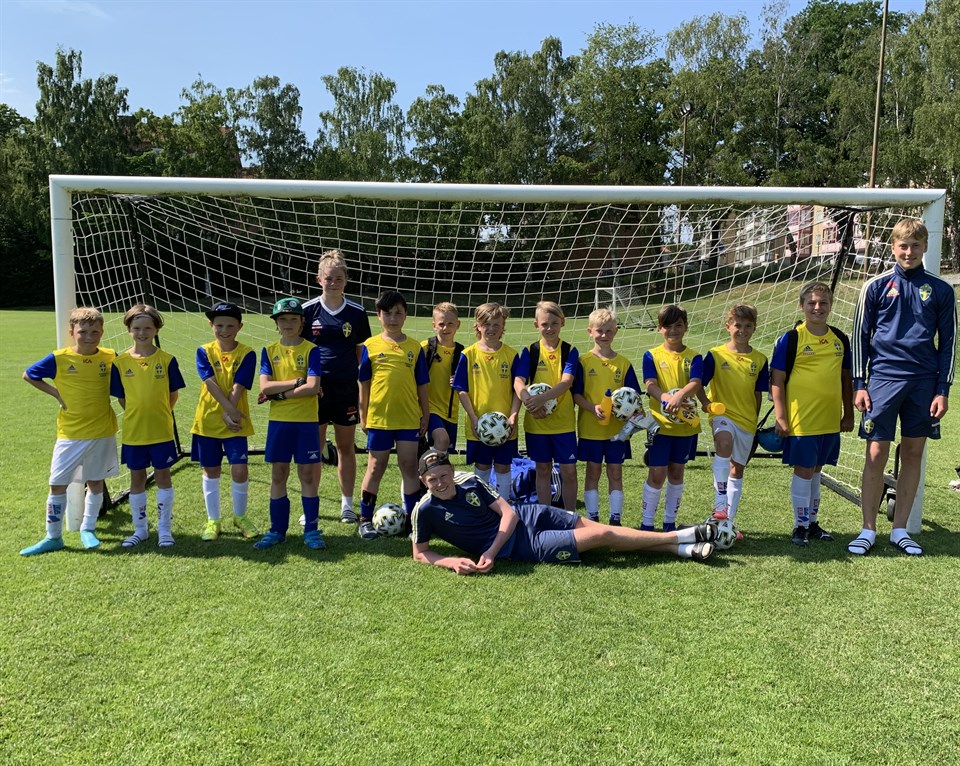 Nöjda barn från fotbollsskolan födda 2010 med sina ledare från IFKs äldre ungdomslag.