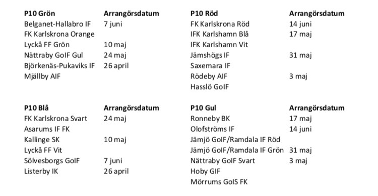 Hej! Vi har nu fått datum för vårens poolspel. Vi kommer då tillsammans med andra lag träffas och spela ett visst antal matcher. Spelformen kommer att vara tre mot tre med sarg. Vi har ännu inte fått några tider men återkommer så fort vi vet. Veckan innan ett poolspel skickar vi ut en intresseanmälan där vi vill att ni svarar om ert barn önskar delta. Följande speldagar gäller: Lördag 4 april - spelplats Mjällby AIF Lördag 2 maj - spelplats Jämjö GoIF Lördag 6 juni - spelplats IFK Karlshamn Mvh Ledarna P-2014