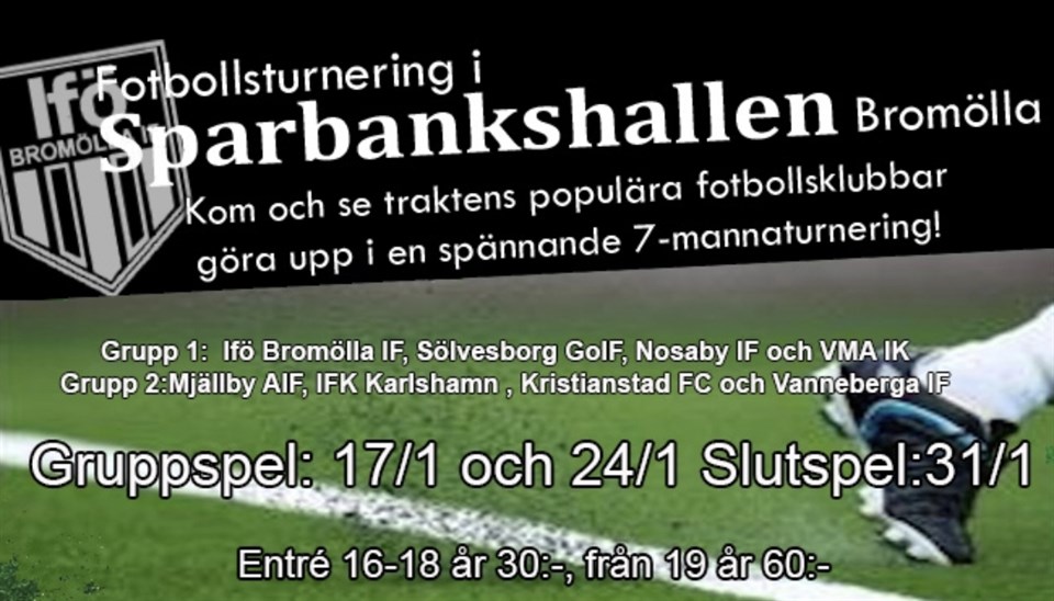Kom och se traktens populära fotbollsklubbar! I en spännande 7-mannaturnering! Grupp 1. 17/1-20 IFÖ Bromölla IF- Sölvesborg GOIF - Nosaby IF - WMA IK. Grupp 2. 24/1-20 Mjällby AIF - IFK Karlshamn - Kristianstad FC - Vanneberga IF. Slutspel 31/1 Herrar 19 dec 2019 0kommentarer